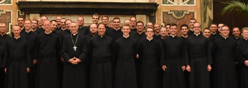 Im Anschluss an die heilige Messe empfing S. Exzellenz Erzbischof Georg Gänswein die SJM in der Sala del Concistoro des Apostolischen Palasts. Wo sonst Papst Franziskus Gäste aus aller Welt empfängt, erzählte Erzbischof Gänswein in lockerer Runde von der wechselvollen Geschichte dieses Audienzsaales und vom vatikanischen Alltag. Am Ende des kurzweiligen Treffens spendete P. Michael Sulzenbacher dem Erzbischof den Primizsegen, und P. Schindele bat ihn im Namen der ganzen Kongregation, Papst emeritus Benedikt unsere Verbundenheit im Gebet und die besten Grüße zu übermitteln. Da sowohl Erzbischof Gänswein zum Rosenkranz mit Papst Benedikt eilte, als auch die SJM in einer Privatkapelle des hl. Vaters im Apostolischen Palast den Rosenkranz betete, war diese Verbindung gleich sehr konkret. Im Rahmen dieses Rosenkranzes erneuerten alle Mitbrüder die Weihe an das unbefleckte Herz Mariens und rundeten so den Jubiläumstag symbolträchtig ab.