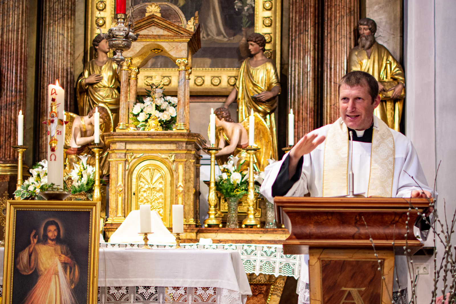 Der Neupriester P. Stephan Waxenberger wird zukünftig in der Pfarre Blindenmarkt als Kaplan tätig sein. Damit war klar, dass auch die erste heilige Messe in der dortigen Pfarrkirche unter größerer Beteiligung der Gläubigen stattfinden wird. Am Sonntag um 11.00 Uhr zog der Primiziant also zum zweiten Mal mit Messkasel bekleidet in die Kirche ein, um eine feierliche Pfarrprimiz zu begehen, zu der – mit voriger Anmeldung – die Gläubigen der Pfarre St. Anna eingeladen waren. In einer kurzweiligen Primizpredigt beleuchtete P. Hans-Peter Reiner, Generalvikar der SJM, das Priestertum aus verschiedenen Perspektiven. Bereits der Hinweis, die aktuelle Gefährdung für eine potentielle Infektion durch einen „Priestervirus“ läge in Österreich bei einem beruhigend Inzidenzwert von 8, sorgte für ein Schmunzeln bei den Gläubigen. (Oder sollte die niedrige Inzidenz uns eher beunruhigen?) Wie jedes Sakrament sei auch die Priesterweihe ein sichtbares Zeichen für eine unsichtbare Wirklichkeit. Die Handauflegung des Bischofs auf das Haupt des Weihekandidaten mache deutlich, wie Gott durch die Weihe Besitz vom Priester ergreife, aber zugleich ihn unter seinen besonderen Schutz nehme. Nicht zuletzt werde dadurch deutlich, wie Gott ihn als „Instrument des Heiles“ verwenden wolle. Verbunden mit dieser Vollmacht sei aber auch die Gefährdung für besondere Versuchungen, z.B. die sog. „Ochsenversuchung“, nach der das Gras auf der anderen Seite des Zauns immer saftiger scheint als das auf der eigenen Wiese. Darüber hinaus gefährde die Überheblichkeit durch das falsche Hängen am Eigenwillen das Wirken des Priesters. „Wir sehen immer nur bis zum Altar, aber Gott sieht von dort bis in die Ewigkeit.“ Im Leben des Priesters gibt es aber auch besondere Freuden: Zu sehen, wie Menschen in ihrem Vertrauen auf Gott wachsen, wie Gott immer neue Wunder der Gnade wirkt, wie nahe Jesus uns in der Eucharistie kommt …, auf besondere Weise darf der Priester diese unsichtbaren Geheimnisse im eigenen Leben erfahren. Die Predigt schloss mit einem Appell an die Pfarre – „Passt gut auf unseren Neupriester auf, aber verwöhnt ihn auch nicht“ – und einem Aufruf zum besonderen Vertrauen an unsere himmlische Mutter Maria, der wir gerade am Muttertag unsere Liebe schenken dürfen.