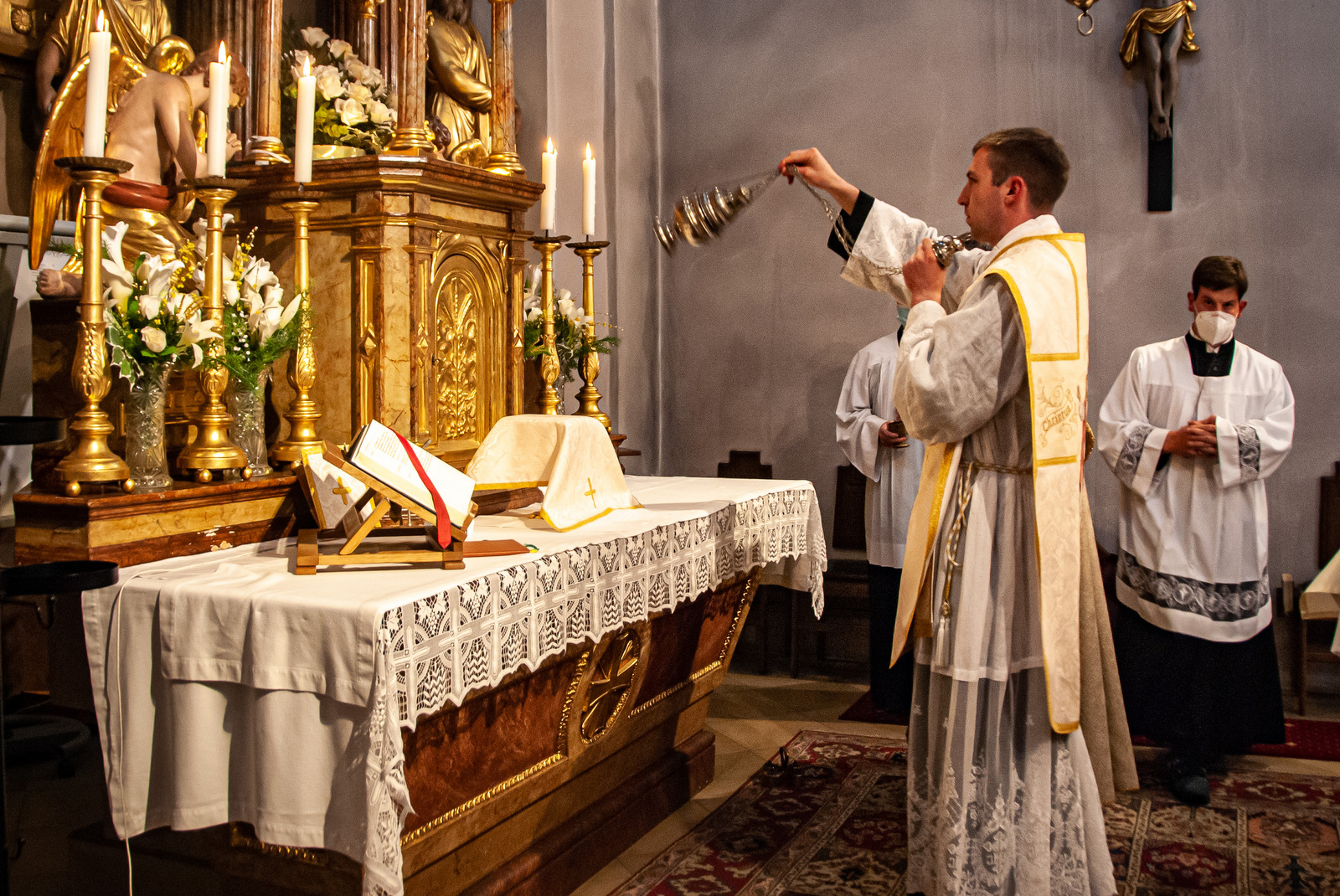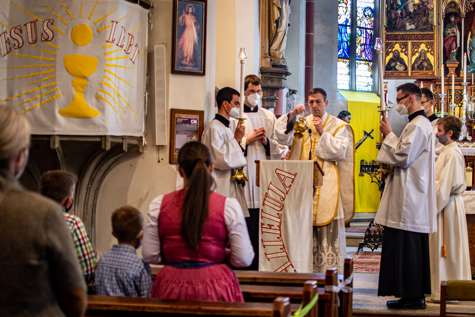 Seine Priesterweihe hatte am Gnadenort Altötting stattgefunden (mehr dazu hier), seine erste heilige Messe zelebrierte P. Stephan Waxenberger in St. Georgen am Ybbsfelde in Niederösterreich zusammen mit seiner Familie, mit seiner Ordensgemeinschaft und weiteren Bekannten – soweit die dortige Pfarrkirche unter den momentanen Umständen Platz bot. Man merkte dem „Priester-Neuling“ seine Aufregung nicht an; alles war bestens vorbereitet und man spürte, wie der Primiziant mit ganzem Herzen „bei der Sache“ war, oder genauer: beim HERRN, dessen Opfer er „in persona Christi“ zum ersten Mal feiern durfte. In der Festpredigt beschrieb P. Paul Schindele, der Generalobere der SJM, den Primizianten als praktisch veranlagte Persönlichkeit, die „sich nicht so leicht unterkriegen lässt“. Als er vor knapp 20 Jahren dem „kleinen Stephan“ im Rahmen eines Zeltlagers zum ersten Mal begegnete, sei ihm der überdimensionale Rucksack unvergessen in Erinnerung geblieben, den der kleine Pfadfinder damals tapfer durch Norwegen geschleppt habe. Aus diesem bodenständigen Charakter sei nun – durch die Gnade Gottes – ein Priester Jesu Christi geworden, ausgerüstet mit der Vollmacht, Brot und Wein in Jesu Leib und Blut zu verwandeln und in der Beichte im Namen Jesu Sünden zu vergeben, kurz: den Menschen Jesus zu bringen. Ein Priesterleben sei darum nur in der Angleichung und der Nachfolge Jesu möglich. Priestersein bedeute, ein zweiter Christus (lat. „alter Christus“) zu werden. P. Schindele zitierte dazu eine Formel aus der Liturgie der Priesterweihe: „Bedenke, was du tust, ahme nach, was du vollziehst, und stelle dein Leben unter das Geheimnis des Kreuzes.“