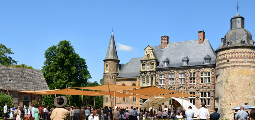 Aber sie sind es ja gewohnt. Haus Assen ist ein „Mitmachhotel“. Nur wenn jeder mithilft, kann das Projekt gelingen. Die Familien schlagen wie jedes Jahr ihre Zelte rund um das Schloss selbst auf, doch damit noch nicht genug: So sorgen beispielsweise die Pfadfinder aus NRW für Unterhaltung in den Abendrunden und beim Postenlauf. Im Wettkampf mit den Papas und Mamas Feuer machen, Lieder komponieren, Hindernisparcours durcheilen – da ist der Spaß vorprogrammiert. Zwischendurch schau ich mal in der Küche vorbei: Dort gibt es eine Riesenportion Nudelsalat zu bewundern, fleißige Mamas machen es möglich.