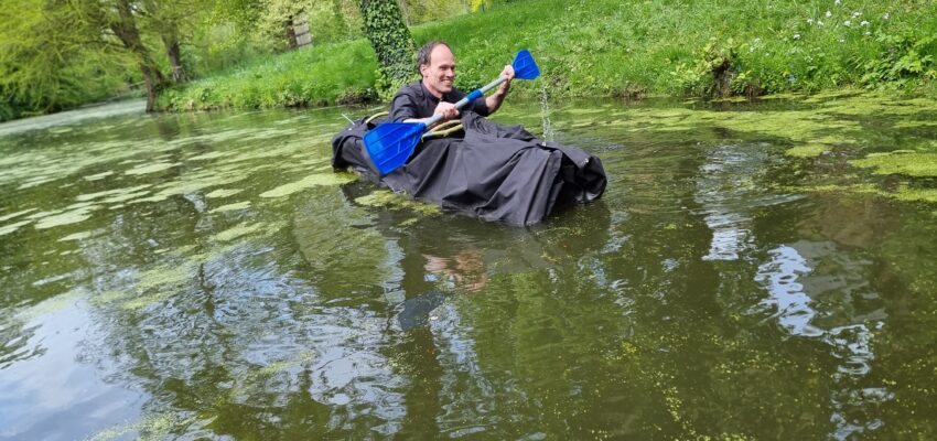 P. Roland ließ sich überreden, sich als Testpersonal zur Verfügung zu stellen und den Eigenbau in der Gräfte (=Wassergraben um das Schloss) auszuprobieren. Und es hat tatsächlich einwandfrei funktioniert!